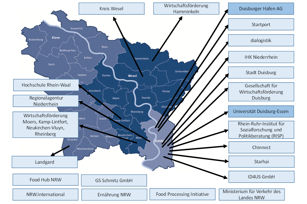 Als Partner eingebunden sind neben der Universität Duisburg-Essen, mit dem Zentrum für Logistik und Verkehr und dem Lehrstuhl Transportsysteme- und Logistik, die Hochschule Niederrhein (Projektkoordination), die Ruhr-Universität-Bochum sowie die Sysplan Gesellschaft für Logistiksystemplanung GmbH. Weitere assoziierte Partner sind u.a. der Kreis Wesel und die Stadt Krefeld, die DeltaPort GmbH & Co. KG (Wesel), die duisport AG (Duisburg), der Rheinhafen Krefeld (Krefeld) und das Start-up Heuremo UG (Duisburg).