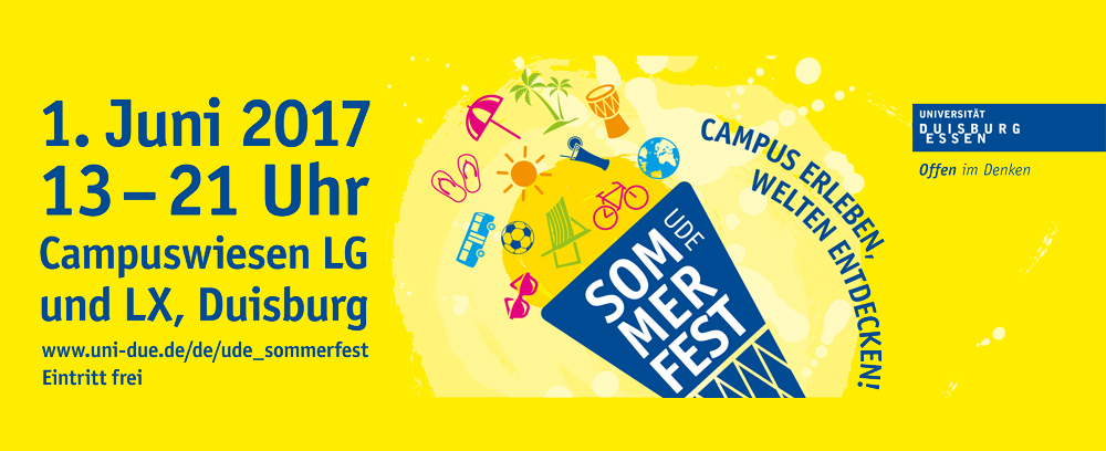 Die UDE sagt Danke: für den Einsatz der Hochschulangehörigen im Namen der Uni, für die gute Zusammenarbeit und für die vielen kleinen und großen Erfolge in der täglichen Arbeit. Deshalb wird gefeiert: Am 1. Juni um 13 Uhr startet das Sommerfest am Campus Duisburg.