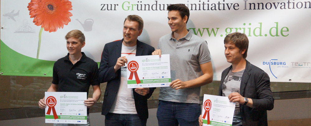Die Sieger des GRIID-Existenzgründerwettbewerbs 2017 stehen fest: UDE-Absolvent Lars Höcker (2.v.r.) und seine drei Mitstreiter überzeugten die Jury mit ihrem Konzept FAMOS. Den 2. Platz belegte UDE-Medizinstudent Ivan Novohatskiy (r.), der zuzeit in Medizin promoviert. Die UDE beteiligt sich mit ihrem small business management (sbm) an der Gründungsinitiative Innovation Duisburg (GRIID).