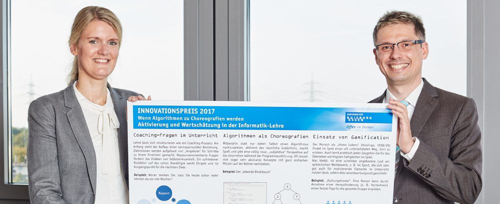 Von Kursen, in denen Teilnehmende ihren Namen tanzen, hat man ja schon gehört. In der Übung „Programmierung mit Java“ von Dr. Thorsten Kimmeskamp setzen aber Studierende Algorithmen choreografisch um. Dafür wurde er jetzt von der Uni ausgezeichnet. Die Prorektorin für Studium und Lehre, Prof. Isabell van Ackeren, überreichte ihm den Lehrpreis für hochschuldidaktische Innovationen in der Lehrpraxis der UDE.