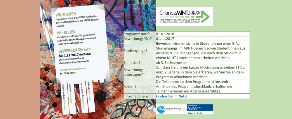 Wie realistisch sind meine Berufsvorstellungen? Das können Bachelor-Studentinnen der MINT-Fächer im einjährigen Programm ChanceMINT.NRW von Expert/innen aus Wissenschaft und Wirtschaft überprüfen lassen. Anmeldeschluss: 1. November.