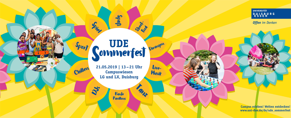 Der Sommer bricht an der UDE schon am 21. Mai an: Dann verwandelt sich der Campus Duisburg in eine bunte Oase mit Live-Bands, Street-Food, internationaler Flaniermeile, Ehrungen und, und, und... Los geht`s um 13 Uhr. Gefeiert wird auf den Campuswiesen zwischen den Gebäuden LG und LX bis in den frühen Abend.