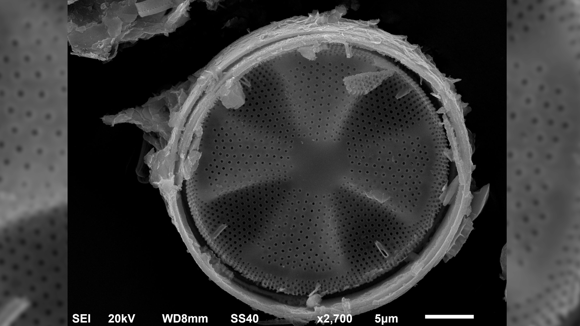 Im Bild: Elektronenmikroskopische Aufnahme einer nur wenige Mikrometer kleinen Kieselalge aus dem NanoSchoolLab.