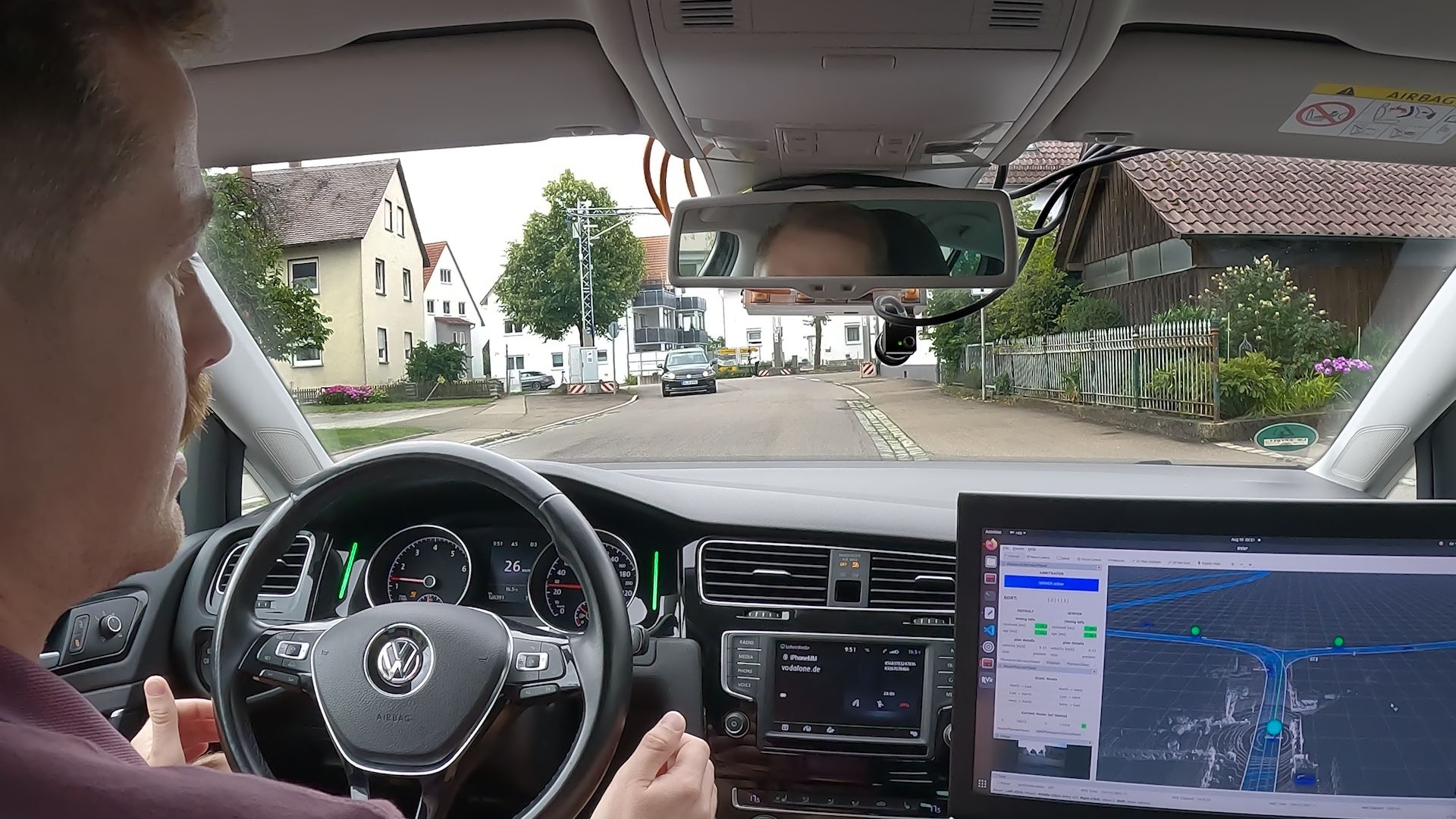 Innenperspektive eines automatisierten Fahrzeuges. Auf dem Bildschirm sind zwei weitere automatisierte Fahrzeugezu sehen, die an einem kooperativen Abbiegemanöver an der Testkreuzung beteiligt sind (Foto: Robert Bosch GmbH).