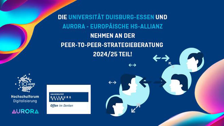 Sich vernetzen, voneinander lernen und gemeinsam Lösungen für den digitalen Wandel in Studium und Lehre finden – das ist das Ziel der fünf Hochschulen, die an der 8. Runde der Peer-to-Peer-Strategieberatung des Hochschulforums Digitalisierung (HFD) teilnehmen. Auch die Universität Duisburg-Essen wurde ausgewählt. Ihr Ziel: die Service- und IT-Strukturen rund um das Projekt „AURORA virtual campus“ des Europäischen Universitätsnetzwerks AURORA zu verbessern.