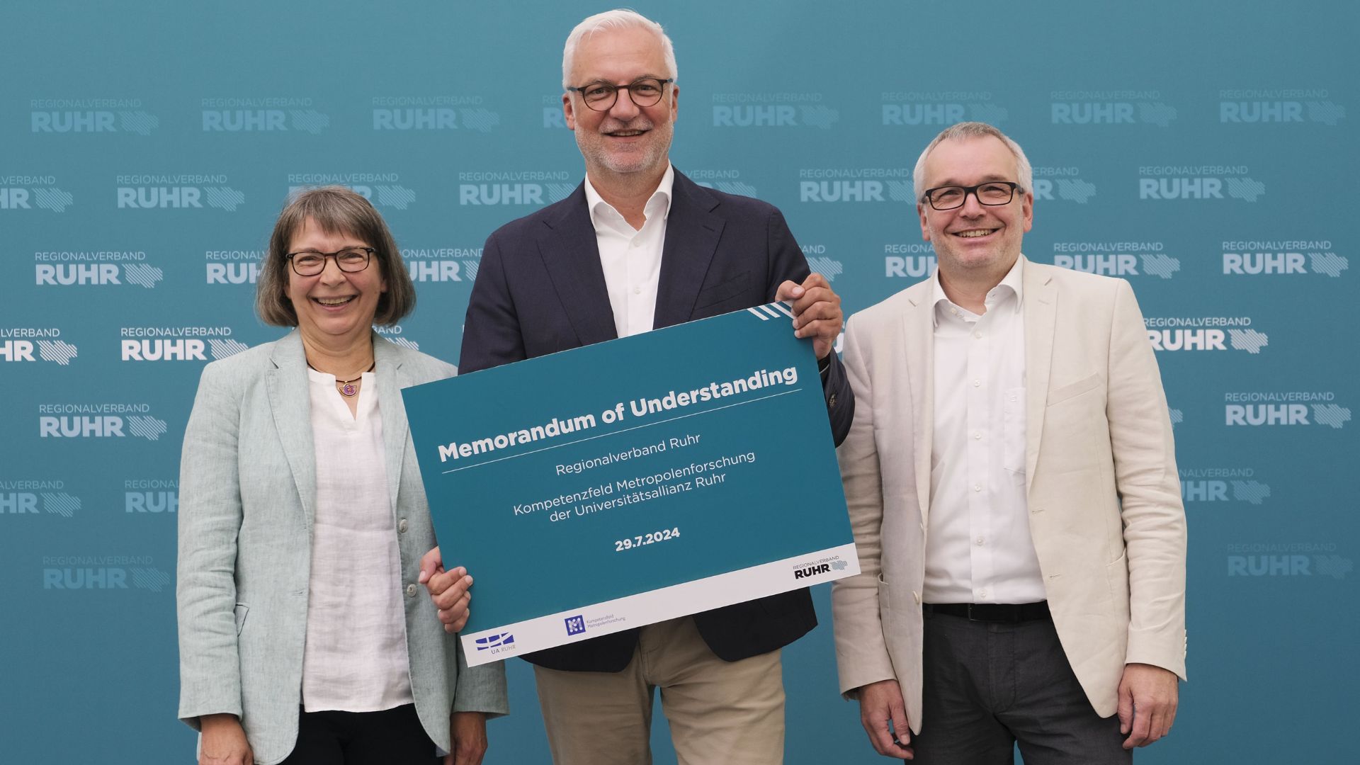 Im Bild (v.l.): Prof. Dr. Uta Hohn (Sprecherin KoMet für die Ruhr-Universität Bochum), RVR-Regionaldirektor Garrelt Duin, Prof. Dr. Thorsten Wiechmann (Sprecer KoMet für TU Dortmund).