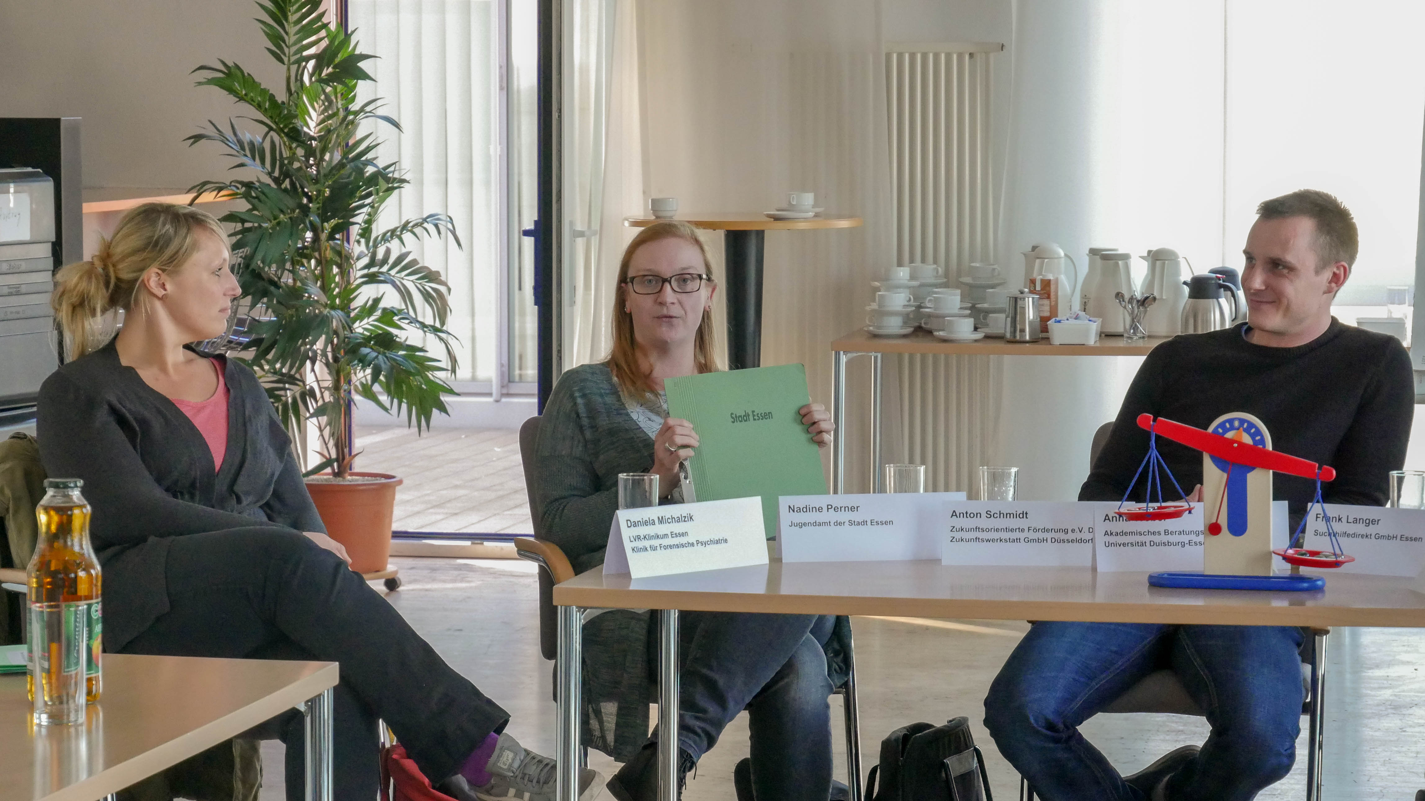 Am 27.02.2019 drehte sich zum Auftakt der Reihe alles um das Berufsfeld Soziale Arbeit. Vier Berufstätige berichteten im Gästehaus des Essener Campus über ihren Alltag, die Herausforderungen ihres Jobs und was man idealerweise mitbringen sollte, wenn man in diesem Bereich tätig sein möchte. Den Anfang machte Frank Langer, der seit vielen Jahren bei der Suchthilfedirekt gGmbH in Essen arbeitet. Er stellte den interessierten Schüler*innen das breit gefächerte Angebot der Suchthilfe vor, in dem man als Sozialarbeiter*in tätig werden kann: Therapie, Überlebenshilfe und Prävention. Das Spektrum reicht vom direkten Kontakt mit den Abhängigen und täglichen Hilfeleistungen bis zum Vortrag innerhalb einer Schulklasse, um frühzeitig über Suchtmittel aufzuklären. Anton Schmidt berichtete von seinen Erfahrungen als Streetworker bei dem Verein Zukunftsorientierte Förderung (ZOF e.V.) in Duisburg. Einen typischen Alltag gebe es dort nicht, denn jeder Tag richte sich nach den Bedürfnissen und Zielen der Jugendlichen, die er begleitet und unterstützt. Auch das Jugendamt der Stadt Essen war mit der Vortragenden Nadine Perner vertreten. Als Symbol für ihre Tätigkeit präsentierte sie eine leere Akte und erzählte davon, wie sich diese immer weiter füllt – denn beim Jugendamt sind die Mitarbeiter*innen dazu angehalten, alles genauestens zu dokumentieren. Die Frage „Wie geht es einem Kind am besten?“ steht dort jeden Tag im Fokus, sodass immer wieder schwerwiegende Entscheidungen getroffen werden müssen: Kann eine Familie vor Ort unterstützt werden? Herrscht eine Gefahrenlage für die Kinder, können sie in ihrem aktuellen Umfeld bleiben oder ist eine andere Unterbringung nötig? Den Schluss bildete Daniela Michalzik. Sie gab Einblicke in ihre Tätigkeit als Sozialarbeiterin in einer Klinik für Forensische Psychiatrie. Dort ist sie für eine gesamte Station (á 11 Patienten) zuständig, auf der psychisch kranke Straftäter*innen untergebracht sind. Ihr Hauptaugenmerk liegt darauf, die noch offenen Angelegenheiten der Patienten zu managen und– im Falle eines Freispruchs oder offenen Vollzugs – alles so gut vorzubereiten, dass ein reibungsloser Übergang möglich ist. Dabei steht sie stetig im engen Kontakt den zuständigen Ärtz*innen und Therapeut*innen, um bestmöglich helfen zu können.