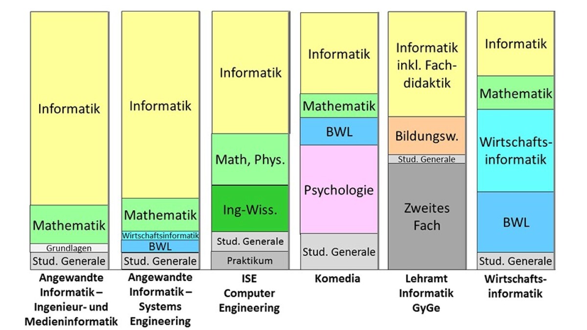 Studieninhalte: Grundlagen der Informatik und Mathematik, Vertiefung im Wahlbereich Informatik (Ingenieur- oder Medieninformatik) und Grundlagenfächer der Ingenieur- oder Kognitionswissenschaften