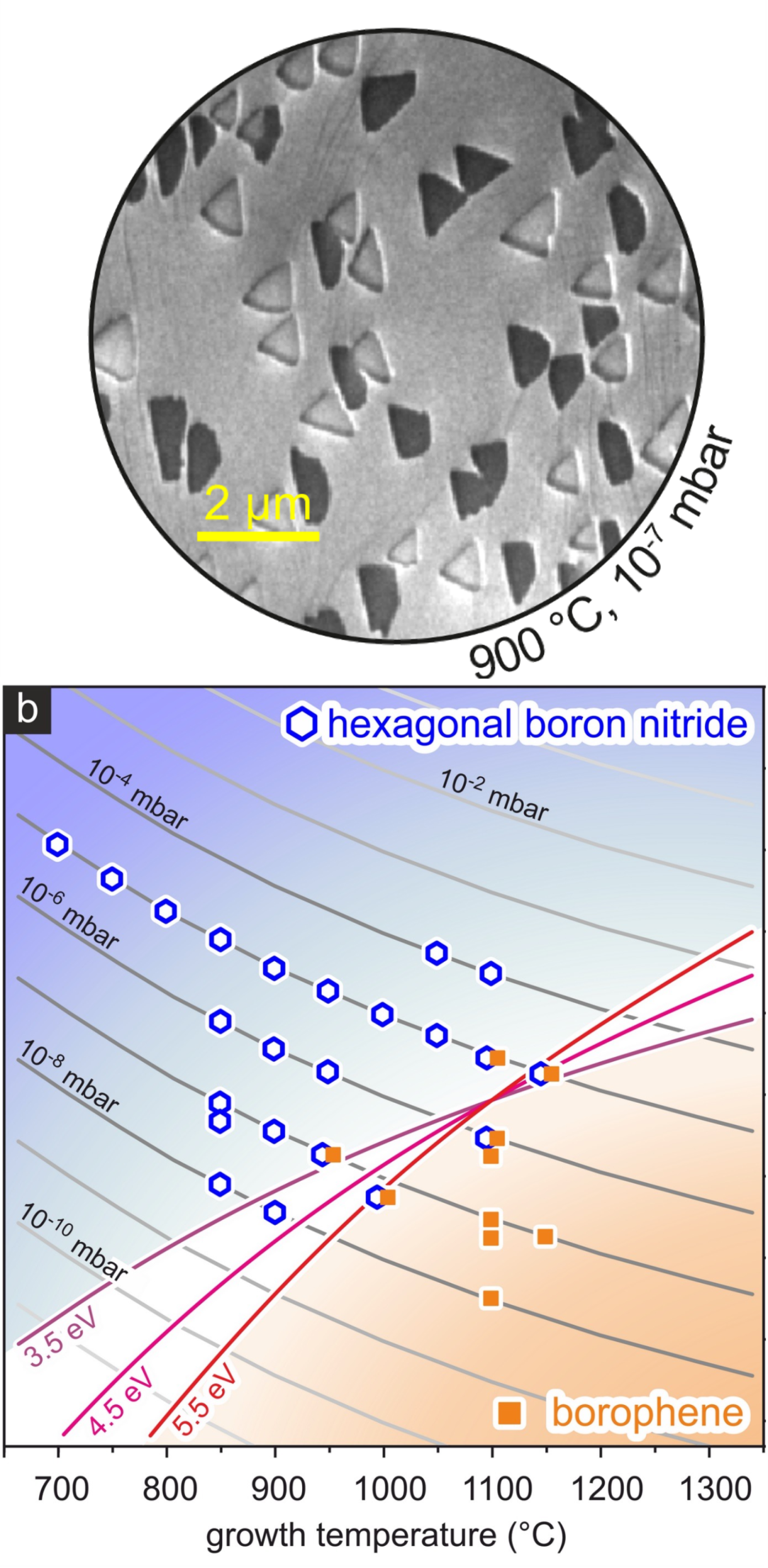 How can perfect monoatomic layers of hexagonal boron nitride - the insulating pondon to graphene - be fabricated? The naive approach of fabricating the 2D layer from the precursor borazene at the highest possible growth temperatures of more than 1000 °C leads to the contrary result: the bi-elemental molecule decomposes into its atomic components boron and nitrogen, the latter desorbs and borophene, a 2D layer of boron, is formed instead. The competition between kinetic limitation and thermally activated decomposition results in an optimum growth temperature of 950°C on the Ir(111) substrate. These findings are the result of a comprehensive study using in-situ reflection profile analysis in electron diffraction (SPA-LEED) and in-operandi electron microscopy (LEEM). The work was published in the highly ranked journal ACS nano.