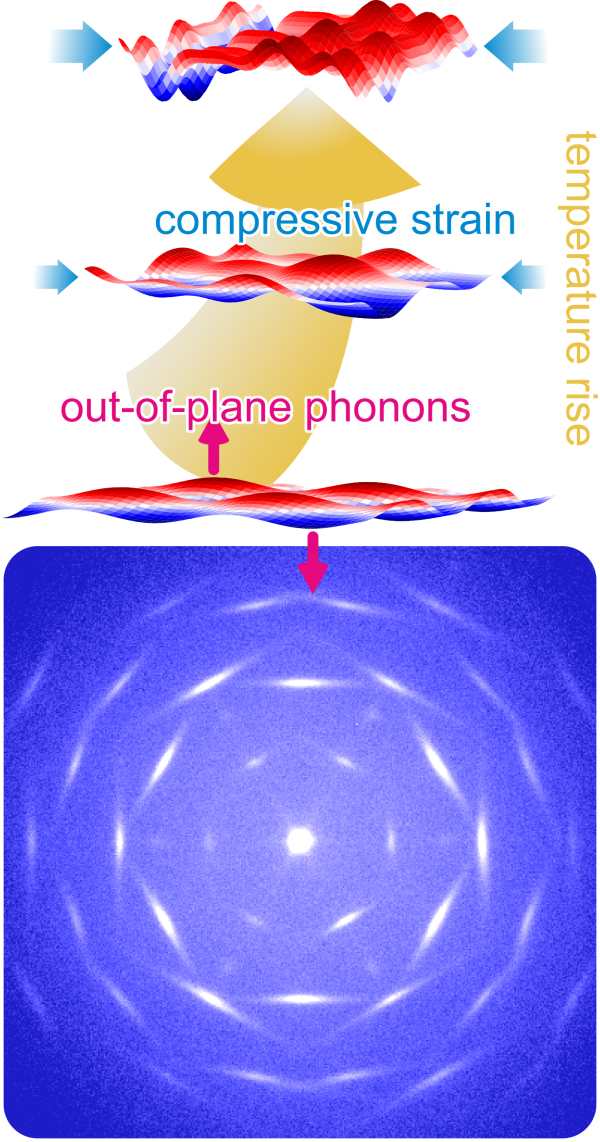 That materials expand when heated is something we learn early on in school, but that this can be completely different in the quantum world is probably unknown. Ultrathin 2D materials, such as hexagonal boron nitride (hBN for short), contract when heated because phonon amplitudes perpendicular to the surface become large, leading to contraction via the membrane effect already described by famous Lifshitz. In cooperation with ICAN at UDE, we have succeeded in demonstrating this contraction for hBN. For this we used high resolution electron diffraction to determine and evaluate the interatomic distance for different growth temperatures. It quickly became apparent that hexagonal boron nitride is an excellent model system for the physics phenomena in such 2D materials, which is why it is likely to remain the object of intensive research in the future.