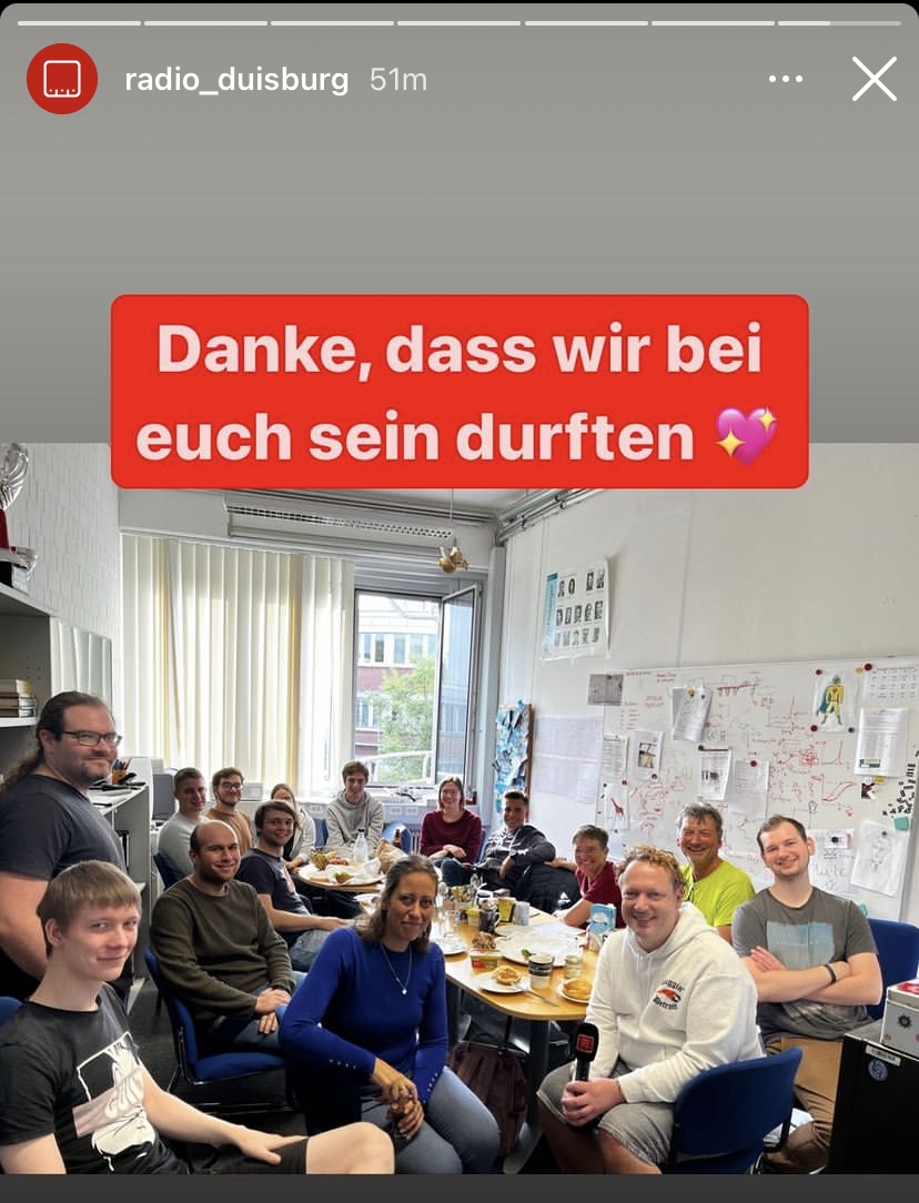 At the beginning of October, the Radio-Duisburg team was on a joint visit to the Schleberger and Mittendorff AGs as part of the "breakfast break". During an entertaining and funny morning we could give an insight into our work and our laboratories. You can listen to a part of our interviews with e.g. our PhD student Sebastian Matschy here and here.