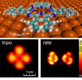 Das Bild zeigt die beiden Phasen von Kohlenstoffmonoxid (CO) auf Kupfer (Cu), aufgenommen mit einem Rastertunnelmikroskop. Der Bildausschnitt zeigt eine Fläche von 6 x 6 nm; es sind einzelne Moleküle zu erkennen