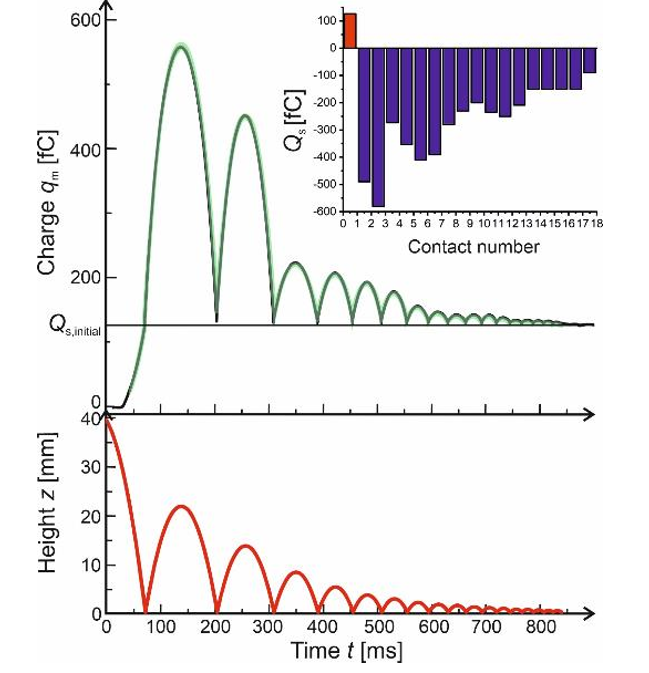 Typical data are plotted in Fig. 3. They are recorded from the bottom Cu plate while a Au sphere is bouncing many times on it. The green line represents an almost perfect simulation of the experimental transient (black line). From the contact times the distance between the Au sphere and the bottom plate, the height, can be calculated. Moreover, we can extract easily the inelastic mechanical energy transfer. The electric charge on the sphere may be calculated from the curvature of the charge curve. The inset in Fig. 3 gives the results for the presented experiment showing that the initial charge changes sign upon the first contact and ranges around a few 100 fC.