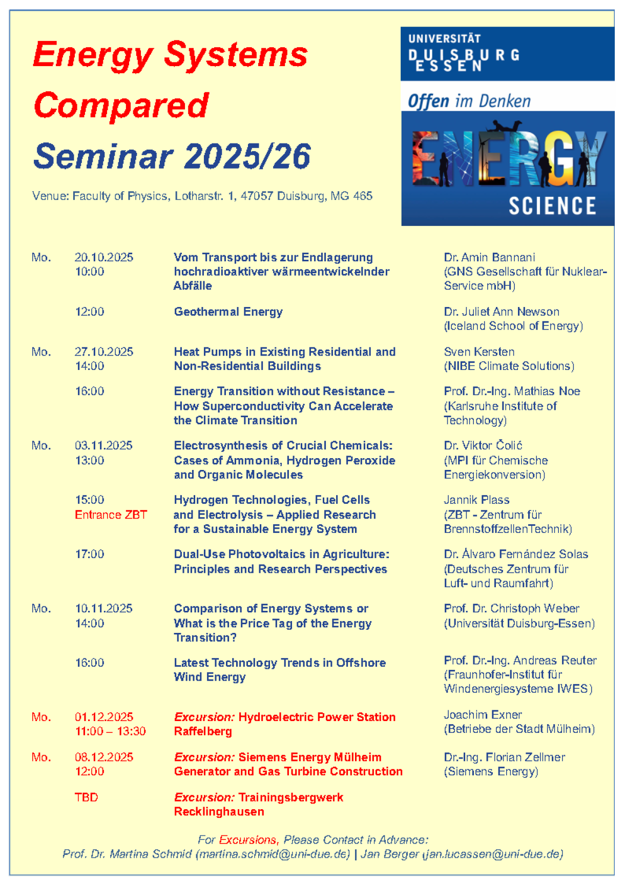 The winter semester 2025/26 is about to begin. Professor Schmid and Jan Berger are offering a seminar entitled 'Energy Systems Compared', featuring many interesting and renowned speakers. Everyone interested is cordially invited to attend. Have a look at the schedule to see what interesting lectures are on offer.