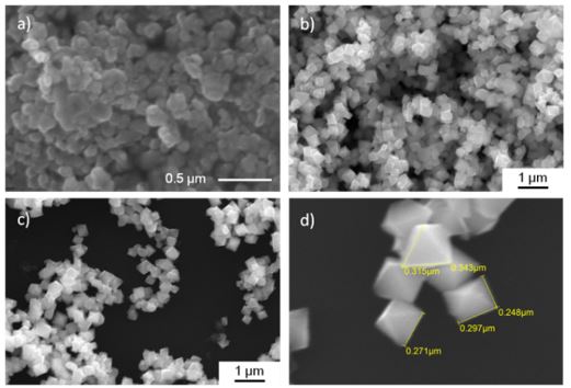 Figure 2: SEM micrographs of octahedral GeTe microcrystallites as-obtained in DIPB (a) and in oleylamine (b), c), d)) at 160 °C.