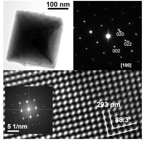 Figure 3: TEM bright field image of an GeTe octahedron in [100] orientation and corresponding ED-pattern (top) and HRTEM image and corresponding FT as inset (bottom).