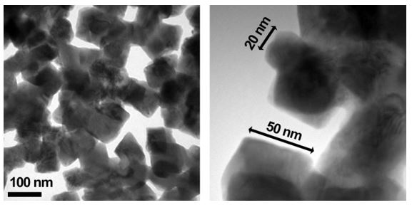 The Bi2Te3 phase was of particular interest and therefore were further analysed by TEM, showing small pseudo-cubic particles with edge lengths of roughly 40 nm. The SAED pattern was in good agreement with the literature data and clearly shows the formation of phase pure Bi2Te3 as proven by comparison with calculated ED-pattern (ICSD-42546).