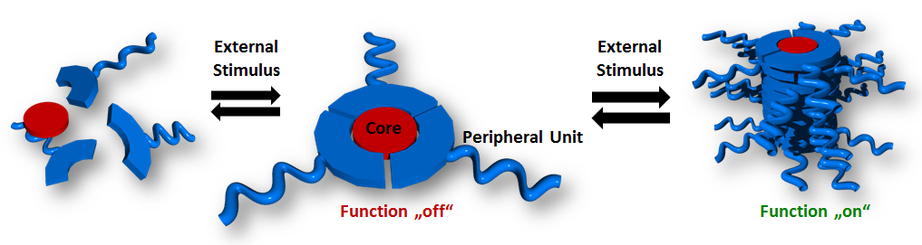 In the recent years, Supramolecular Chemistry has evolved into an effective approach to new functional materials. Combining building blocks by complementary binding sites leads to supramolecular aggregates with new properties e.g. liquid crystallinity. The advantage of a supramolecular approach is its versatility and dynamic, offering the materials to respond to changes of their environment. Our group is interested in utilizing the principles of Supramolecular Chemistry for the synthesis of novel liquid crystals. By developing a modular system of complementary core and peripheral units, our group aims to establish a tool box for the synthesis of liquid crystalline assemblies with tailor-made properties.