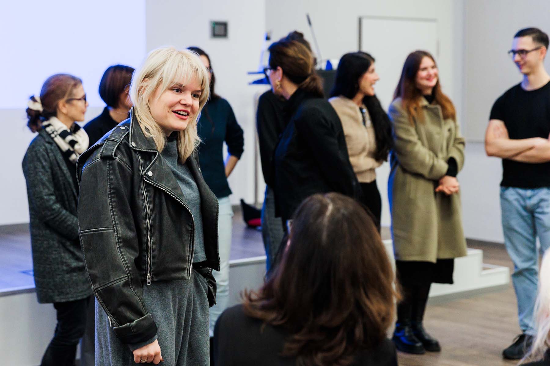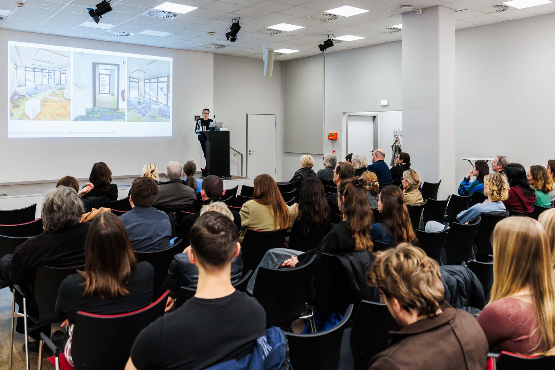 Afterwards, art professor Dr. Susanne Weirich guided the guests through the exhibition featuring the nine designs. Many students in the seminar answered the question of what silence looks like with images of nature: some of the works feature themes of water and forests. The design of the Room of Silence, based on the winning design by student Vanessa Kuhn, was open to visitors after the event. In addition, many of the students who submitted designs in 2020 were available to answer questions.