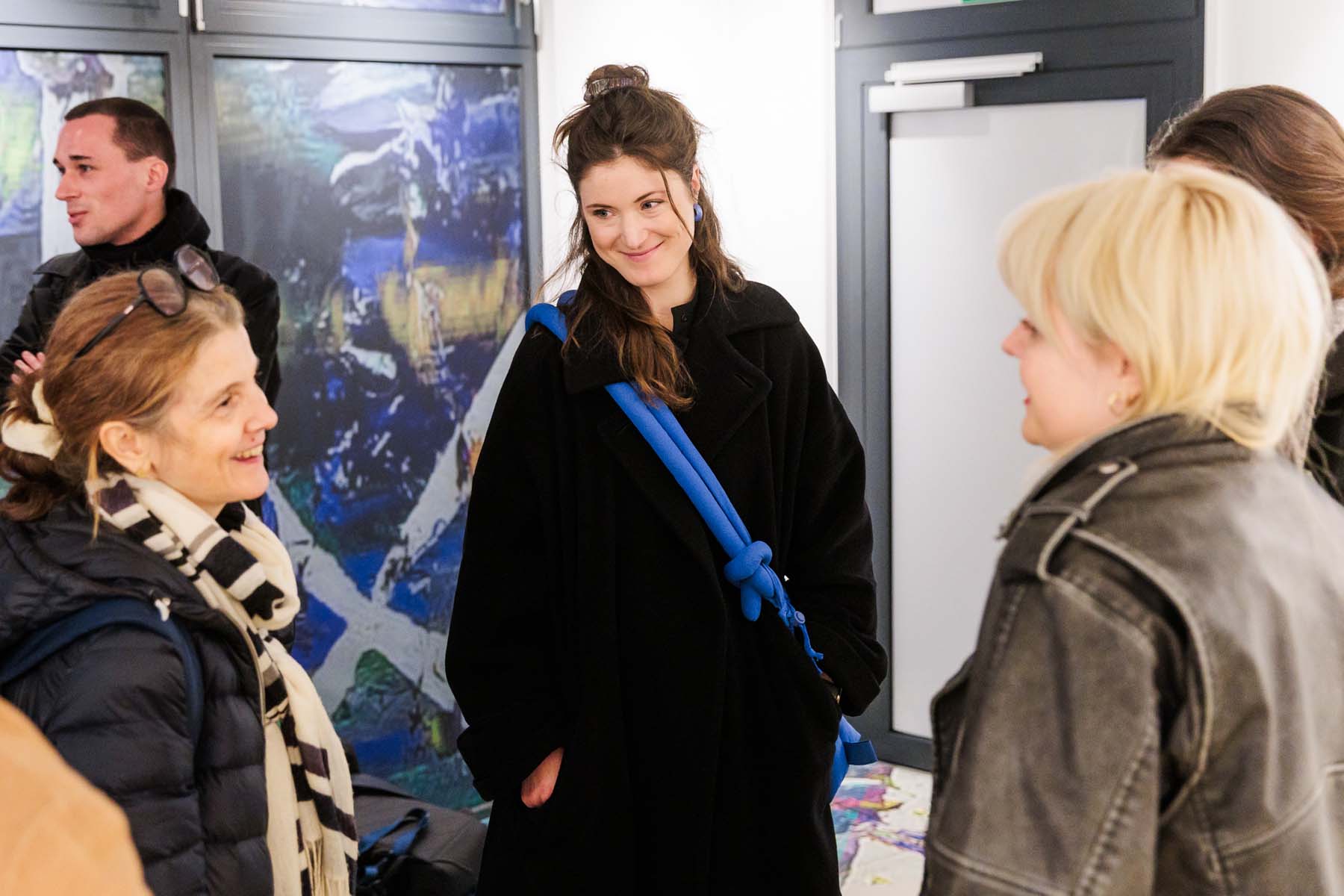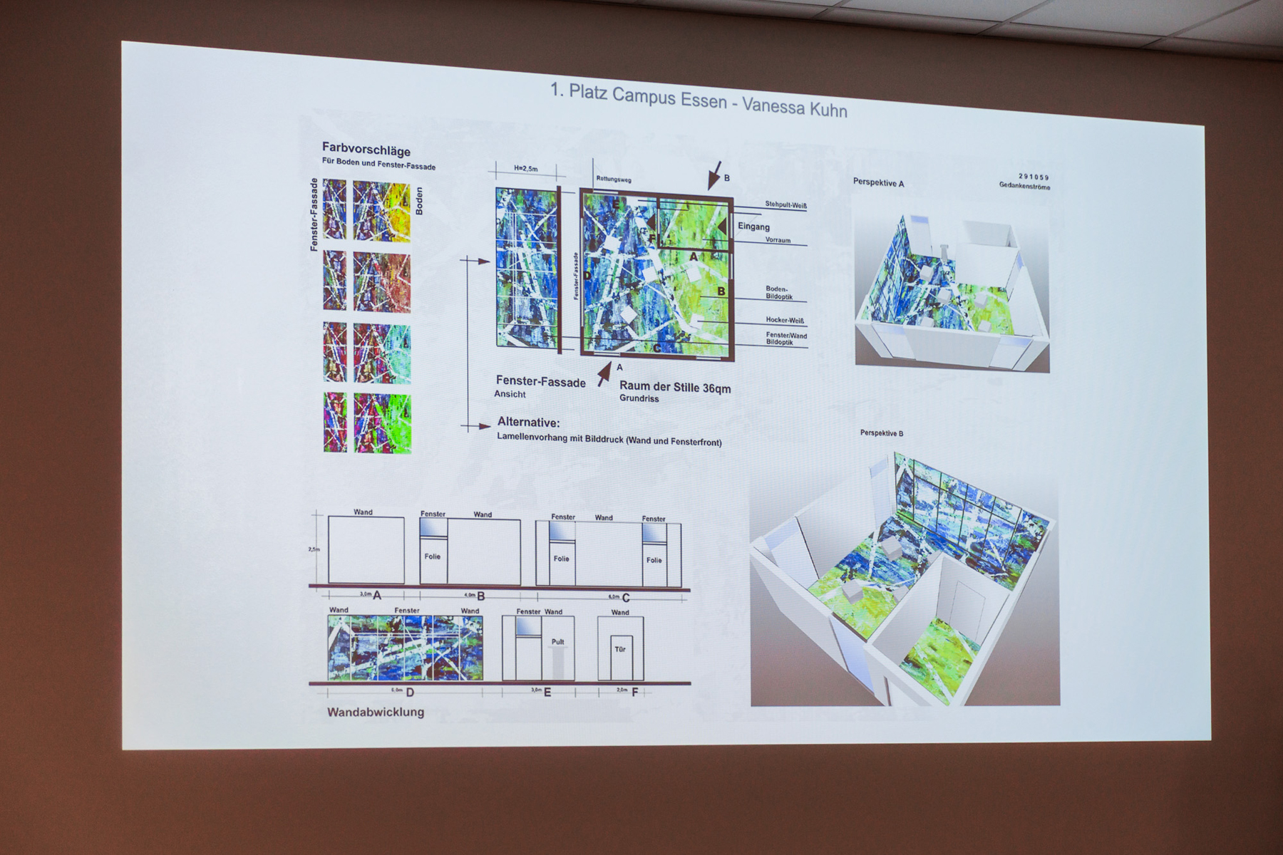 Im Anschluss führte Kunstprofessorin Dr. Susanne Weirich die Gäste durch die Ausstellung mit den neun Entwürfen. Die Frage nach dem Aussehen von Stille beantworteten viele Studierende des Seminars mit Naturbildern: In einigen der Arbeiten finden sich Themen von Wasser und Wäldern. Die nach dem Sieger-Entwurf der Studentin Vanessa Kuhn realisierte Gestaltung des Raums der Stille konnte nach der Veranstaltung besichtigt werden. Außerdem standen viele der Studierende, die 2020 Entwürfe eingereicht hatten, für Fragen zur Verfügung.
