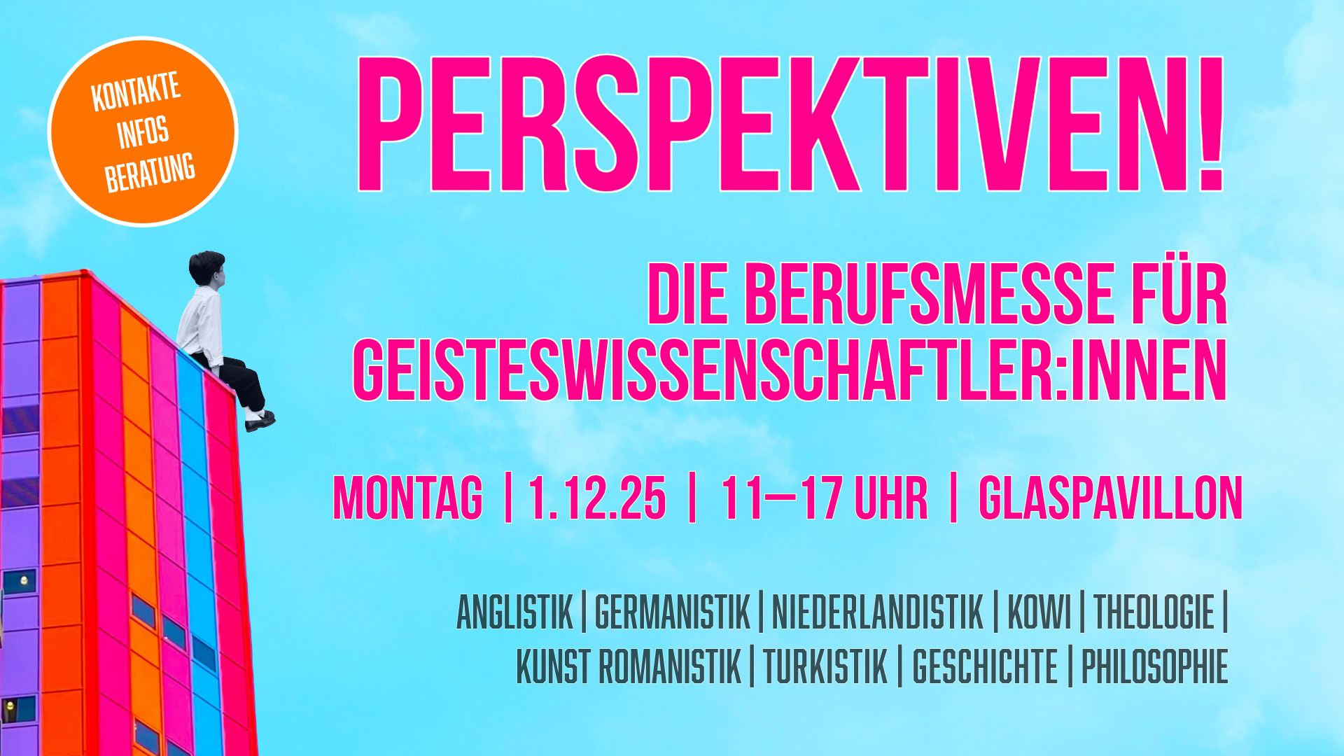Neugierig darauf, was man mit einem geisteswissenschaftlichen Studium beruflich so alles machen kann? Dann ist Perspektiven! Die Berufsmesse für Geisteswissenschaftler:innen genau das Richtige. Am 1. Dezember können u.a. Kontakte zu regionalen Firmen geknüpft werden.