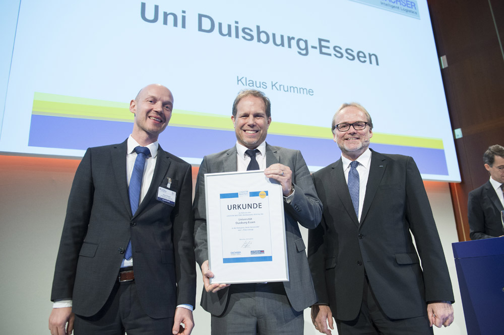 Beim Wettbewerb „Logistik Masters“ gewann in diesem Jahr die Universität Duisburg-Essen den ersten Platz des Logistik-Hochschul-Rankings und sicherte sich somit den Titel „Beste Universität 2016“. Die Urkunde nahm Geschäftsführer des Zentrums für Logistik & Verkehr Klaus Krumme stellvertretend für die Logistik-StudentInnen der UDE am 20. Oktober in Berlin entgegen.