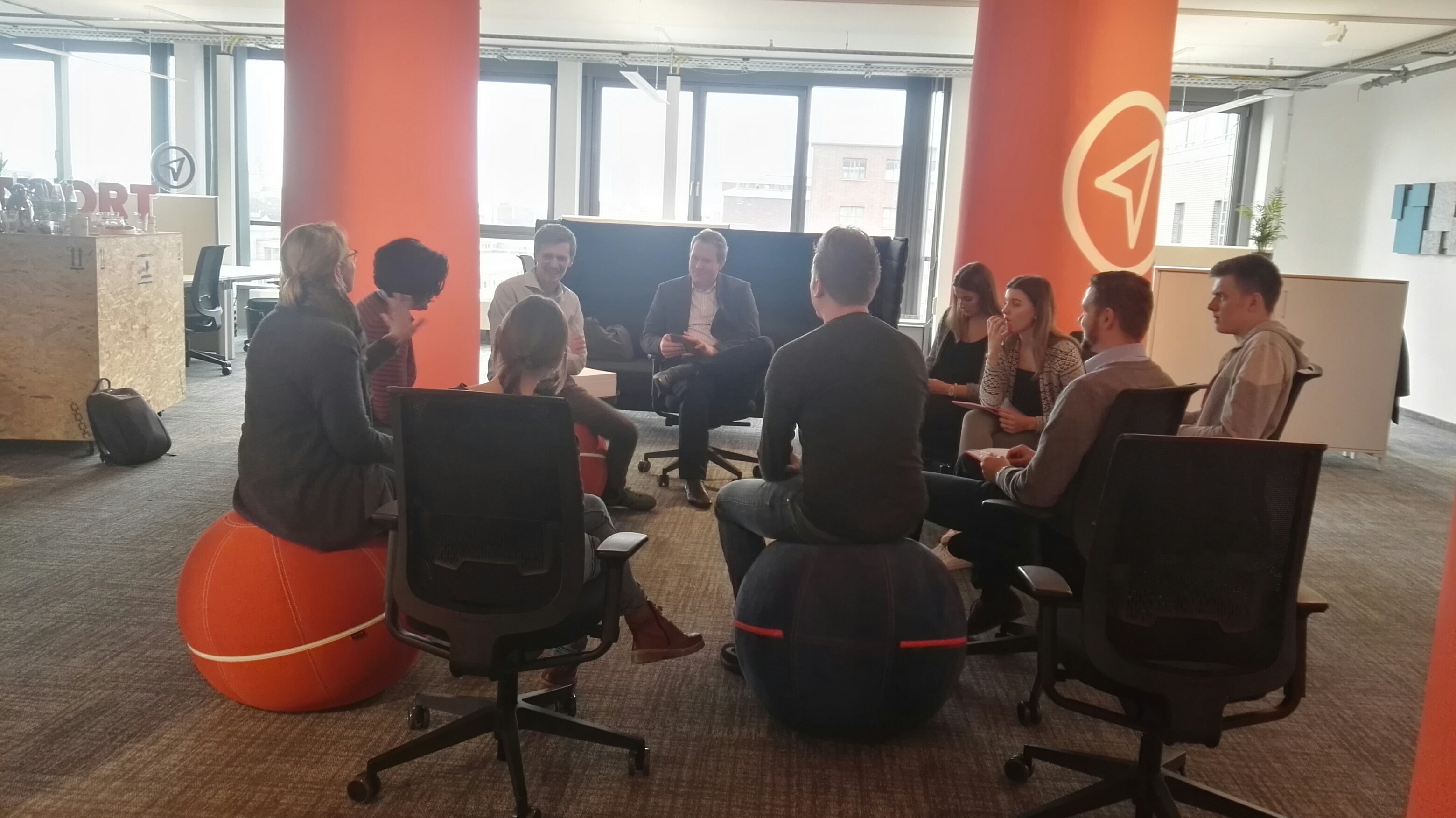 Circa zwanzig TeilnehmerInnen teilten sich in startports Räumlichkeiten auf, um den gewählten Themen in jeweils zwei Gruppen auf den Grund zu gehen. Das offen gestaltete Innovationszentrum des Duisburger Hafens unterstützt durch Architektur und Innendesign kreative Denkprozesse.
