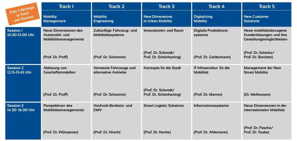 Auf dem 11. Wissenschaftsforum 2019 rücken zukünftige Dimensionen der Mobilität z.B. durch den Einsatz neuer Antriebe und Digitalisierungstechniken in den Diskussionsfokus. So sind Beiträge willkommen, die sich mit dem Mobilitätsmanagement, der Mobilitätstechnik, urbaner Mobilität und Digitalisierung in der Mobilität sowie mit neuen Kundenlösungen für die Mobilität beschäftigen. Beiträge können in folgenden Tracks angesiedelt werden: