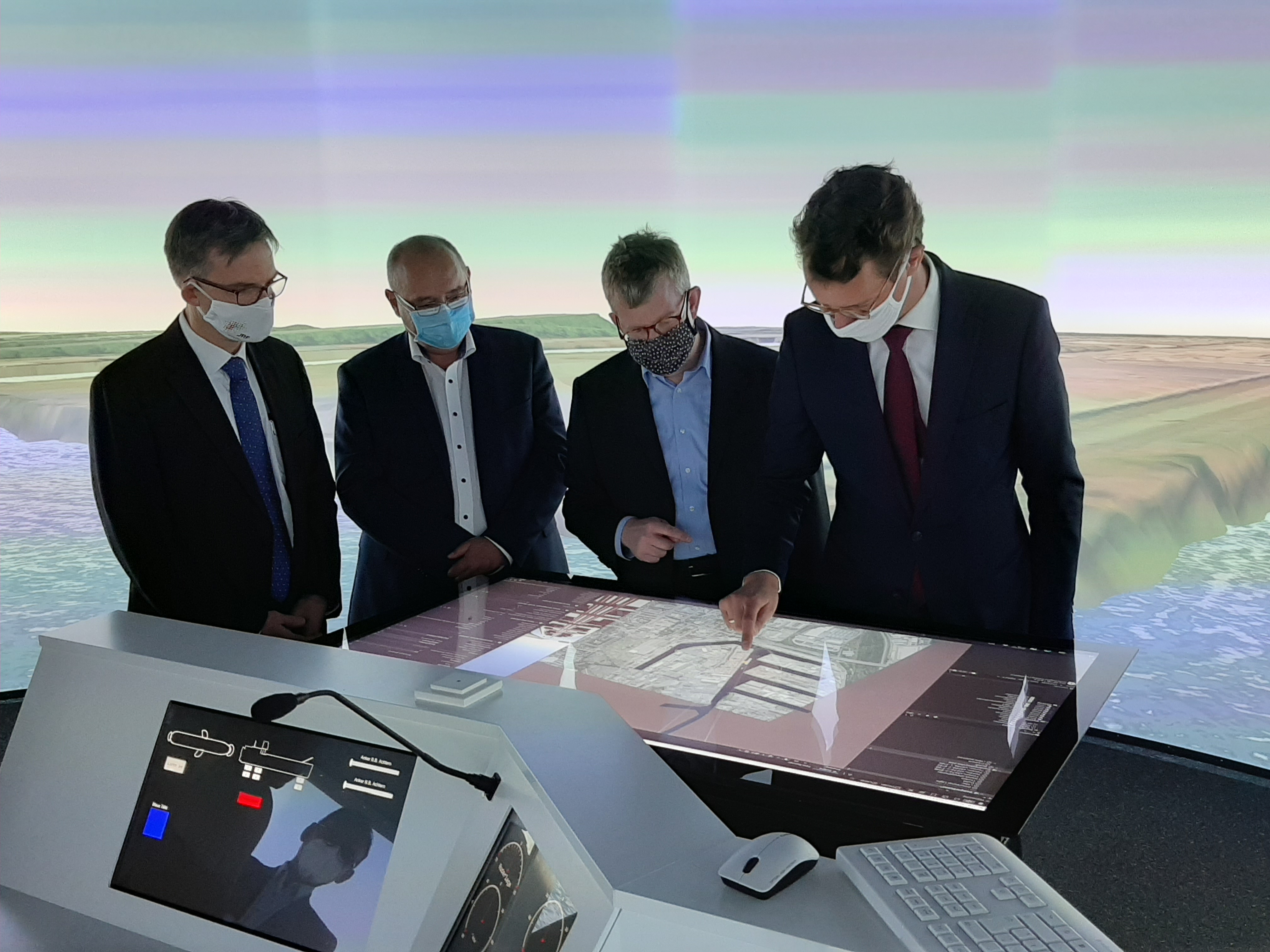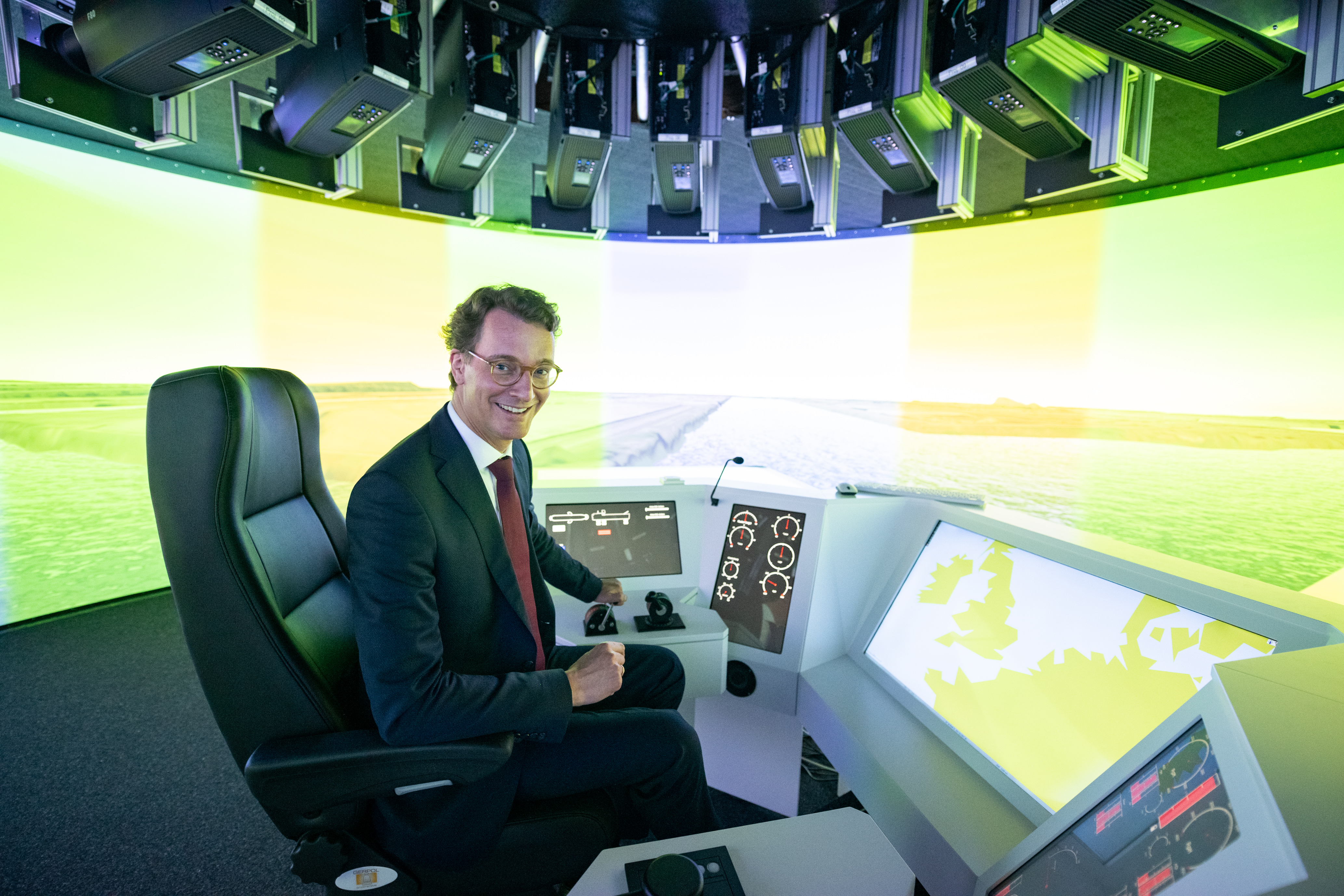 Transport minister Wüst inspects the steering stand in the VeLABi projection system,