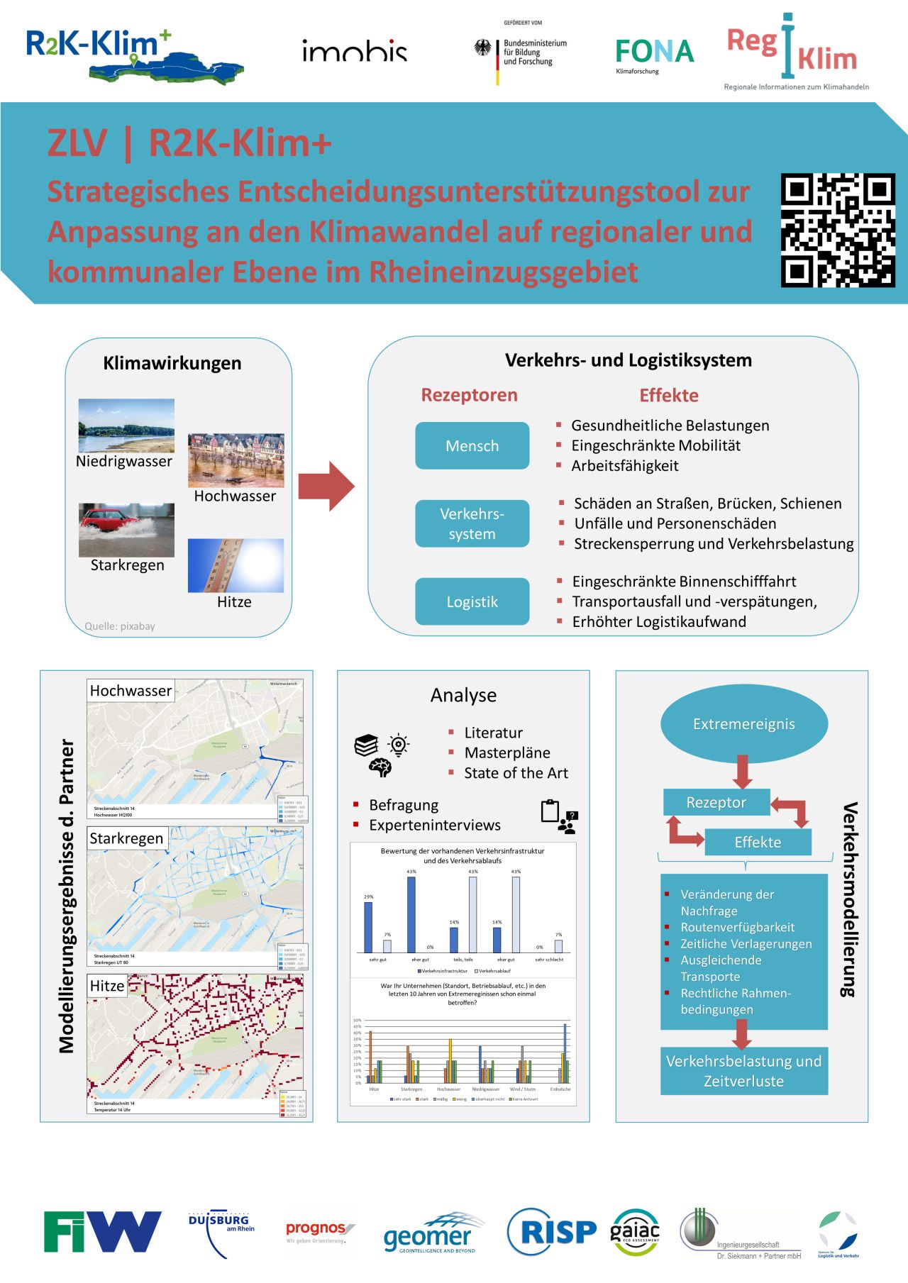 Klimawandelanpassung und Klimaschutz müssen zusammen gedacht werden, so das fachliche Credo des heutigen Fachforums „Zukunftsfähige Logistik“ in Duisburg. Dort hatte auch das BMBF-geförderte Projekt R2K-Klim+ des Zentrums für Logistik und Verkehr der Universität Duisburg-Essen eine bedeutende Rolle. Seit November 2021 unterstützt das Zentrum für Logistik und Verkehr die Stadt Duisburg im BMBF-geförderten Projekt R2K-Klim+. Das Forschungsprojekt R2K-Klim+ thematisiert die Auswirkungen des Klimawandels sowie entsprechende Klimaanpassungsmaßnahmen auf regionaler und kommunaler Ebene. Mithilfe von Klimaprojektionen werden mögliche Zukunftsbilder erstellt und die Auswirkungen auf das Rheineinzugsgebiet und die Stadt Duisburg analysiert. Die Ergebnisse werden einem Entscheidungsunterstützungssystem zugeführt, das regionalen und kommunalen Entscheidungsträgern als transparente und nachvollziehbare Handlungsgrundlage für Investitionsentscheidungen dienen soll. Ein Team der ZLV-Geschäftsstelle und des imobis der Universität Duisburg-Essen, welches von Herrn Prof. Dirk Wittowsky geleitet wird, konzentriert sich in diesem Projekt auf die Auswirkungen des Klimawandels auf den Verkehr und die Logistik. Das ZLV untersucht die Betroffenheit von Klimafolgen wie Starkregen, Hitze, Hochwasser und Niedrigwasser für das Verkehrsnetz in Duisburg und modelliert die unmittelbaren Auswirkungen auf die Logistikbranche.