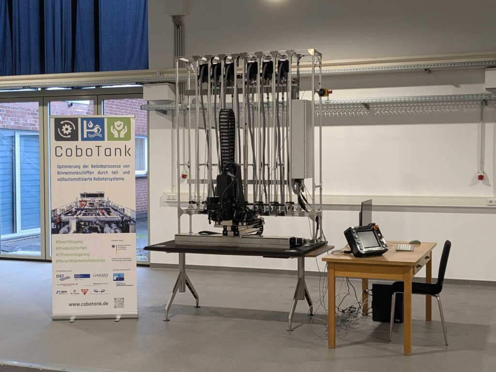 Nach der Abnahme des Demonstrators kann nun die Versuchsstation vervollständigt werden. Diese umfasst den Demonstrator des CoboTanks im Maßstab 1:10, ein Modellschiff samt Tankschiffsektion und eine Bedienstation für den Roboter zur kraftunterstützten Feinpositionierung des Produktschlauchs. Damit kann der betreffende neue Prozessablauf an der Versuchsstation im Port Automation Lab des HaFoLa fortentwickelt und zeitnah vorgeführt werden.