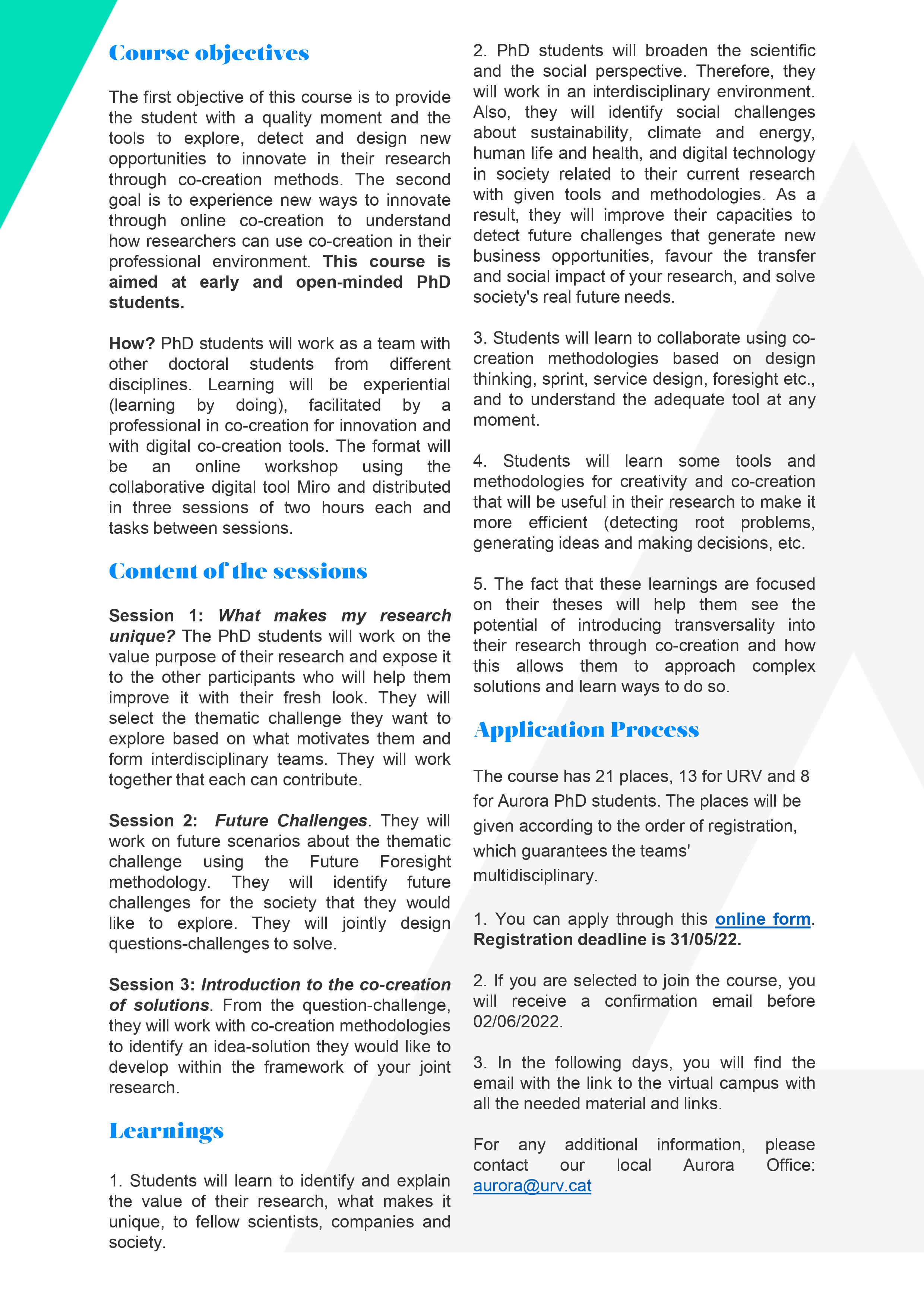 Die Universitat Rovira i Virgili in Tarragona präsentiert den Kurs How to innovate in your research als einen ersten Zugang zu Co-Creation-Methoden, die in Forschung, beruflichen und persönlichen Leben angewendet werden können. Auf der Grundlage der Forschung, unabhängig davon an welchem Punkt man sich befinden, werden in drei Erfahrungsworkshops, reale Herausforderungen und multidisziplinäre Designlösungen erforscht.