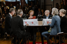 Panel participants Sabine Lehmann, Jens Gurr, Simone Schwanitz, Metin Sitti, Patrick Cramer