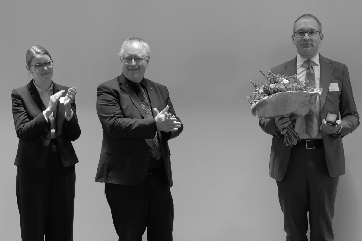 In 2025, the Studienstiftung des deutschen Volkes – German Academic Scholarship Foundation – celebrates its 100th anniversary. On May 23, UDE scholarship holders organized a "Science Day" with lab tours, presentations, panel discussions and more. Guests included NRW Minister of Culture and Science, Ina Brandes, the President of the Studienstiftung and Rector of the University of Bonn, Professor Michael Hoch, and UDE Rector Prof. Barbara Albert. At the end of the event, for long-standing service as liason professor for the Studienstiftung, Prof. Jens Martin Gurr was awarded the Daidalos-Münze by Studienstiftung President Prof. Hoch and representative Dr. Insa Braun.