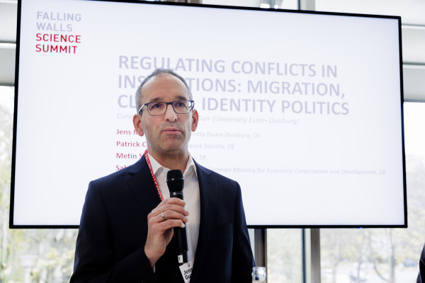 At the "Falling Walls Science Summit" in Berlin (November 7-9, 2024), Prof. Jens Martin Gurr participated in a panel on "Regulating Conflicts in Institutions: Migration, Climate Change, Identity Politics ...". Moderated by BMZ communication expert Sabine Lehmann, the panel included Prof. Patrick Cramer (President of Max Planck Society), Dr. Simone Schwanitz (Secretary General of Max Planck Society) and Prof. Metin Sitti (President of Koç University, Istanbul). The panel discussed ways in which institutions can handle the key present-day conflicts arising in present-day plural societies in ways compatible with democracy and so as to safeguard the continued functioning of these institutions. Prof. Gurr, who had been asked to provide the opening input, here introduced key concepts from the two collaborative projects "Cultures of Compromise" and "Agonistic Plurality".