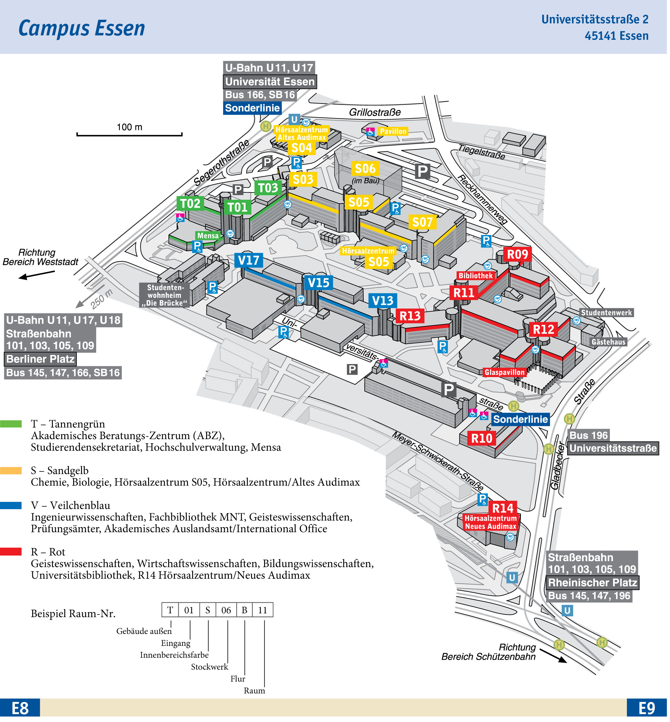 am Kreuz Essen-Nord auf die B 224 Richtung Essen der Beschilderung Universität folgen; recht von der Gladbecker Straße in die Universitätsstraße einbiegen