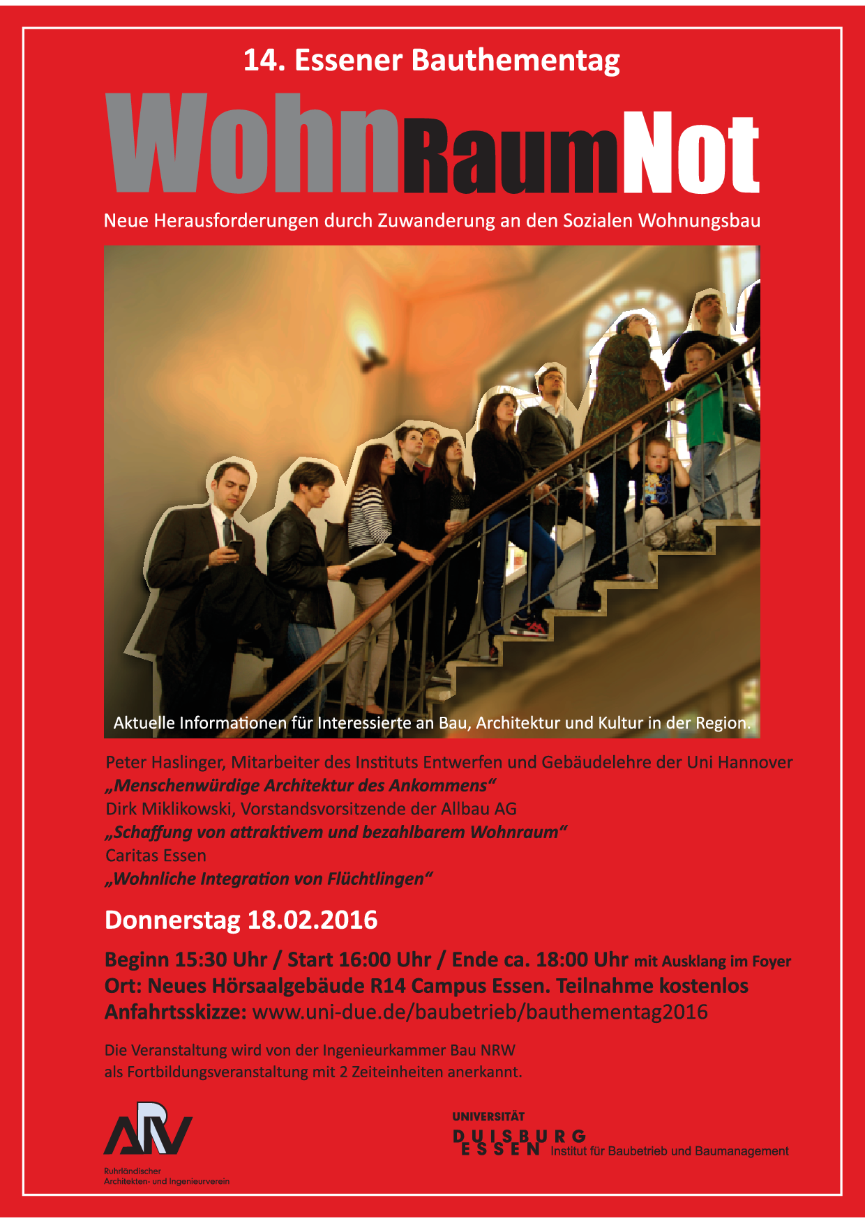 Namhafte Referenten aus Hochschulen, Wohnungswirtschaft und Sozialverbänden, werden über geeignete Flüchtlingsarchitektur, wohnliche Integration und den sozialen Wohnungsbau referieren.