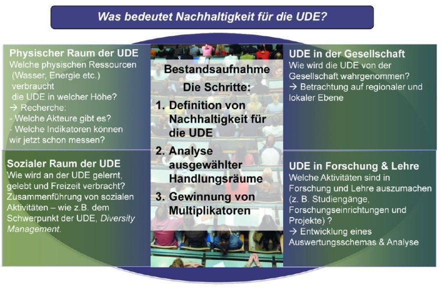 Die Universität Duisburg-Essen (UDE) hat die COPERNICUS-Charta im Jahr 2002 unterschrieben und ist damit die Selbstverpflichtung eingegangen, sich am Leitbild der Nachhaltigkeit zu orientieren. Das bedeutet, dass sie ihre Lehrenden, Forschenden, Verwaltungsangestellten und Studierenden bei der Annahme und Ausführung der in der Charta enthaltenden Leitprinzipien einer nachhaltigen Entwicklung unterstützen möchte. Mit diesem Hintergrund ist der Universität die Förderung einer Nachhaltigkeitsorientierung in Forschung, Lehre sowie in der institutionell-administrativen Arbeitsweise ein zentrales Anliegen. Aktuell setzt sich das Rektorat im Rahmen des Hochschulentwicklungsplans 2009-2014 das strategische Ziel, die "Verpflichtung zum Engagement bei der Nachhaltigkeit" verstärkt voranzutreiben.