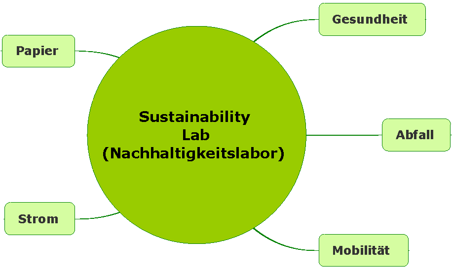 Die SustLabs sind Nachhaltigkeitslabore, die den am Massachusetts Institute of Technology (MIT) entwickelten Ansatz der Living Labs, auf den Umgang mit nachhaltigen Produkten und Handlungsweisen zu adaptieren. Ausgangspunkt ist die Frage, wie Nachhaltigkeit im Büroalltag wahrgenommen und umgesetzt wird. Die SustLabs ermöglichen den neuen Zugang zum Forschungsfeld der Nachhaltigkeitskommunikation und beziehen den Menschen in seiner kreativen Ganzheitlichkeit, seiner Sinneswelt samt seinen Fähigkeiten, Einstellungen, Ideen, Vorbehalten und Routinen in die Forschung ein. Die beobachteten Veränderungen im Büroalltag umfassen persönliche Handlungsempfehlungen wie z.B. Licht ausschalten beim Verlassen des Büros und den Einsatz von ressourcenschonenden Produkten wie schaltbaren Mehrfachsteckern. Die folgende Grafik zeigt eine detaillierte Übersicht über die im vergangenen Jahr erstmalig in sieben Büros der UDE betrachteten Kategorien: |