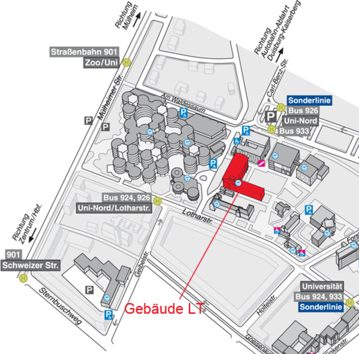 The building LT is located between the characteristic Campi L (Lotharstr.) and M (Mülheimer Str.). The building is particularly recognizable by its shape and the large clean room laboratory. The entrance is on the inside of the building (near the NETZ building). It can be reached from the parking lot at Lotharstr. or from the university parking lot Carl-Benz-Str. A detailed map of the building on the Duisburg campus can be found on the University's website: