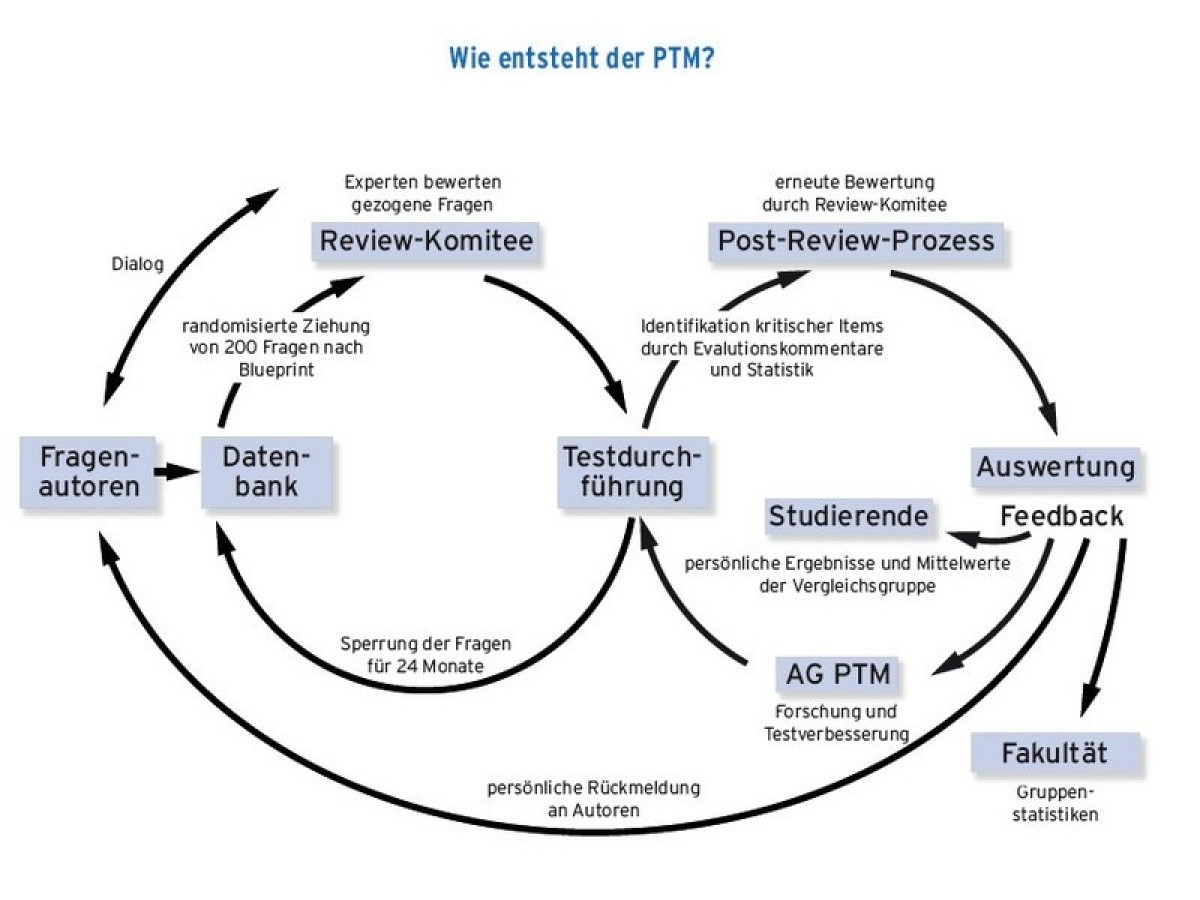 Der Progress Test Medizin (PTM) ist ein formatives Prüfungskonzept, welches im Jahr 1999 an der Charité - Universitätsmedizin Berlin eingeführt wurde. Zurzeit findet der PTM an 16 Fakultäten in Deutschland und Österreich statt, an der Medizinischen Fakultät Essen wurde der PTM im Sommersemester 2012 etabliert. Der PTM besteht aus 200 Multiple Choice Fragen, die einen Querschnitt des Wissensniveaus darstellen, das von einer Absolventin/einem Absolventen an ihrem/seinem ersten Tag im Berufsleben erwartet wird. Der Progress Test findet zu Beginn eines jeden Semesters statt und dauert maximal drei Zeitstunden. Bei einer richtigen Antwort erhalten die Studierenden einen Punkt, bei einer falschen Antwort wird ihnen ein Punkt abgezogen. Antworten mit „Weiß nicht“ haben keinen Einfluss auf dem Ergebnis. Die „Weiß nicht“-Antwortoption ermöglicht eine Selbsteinschätzung des Wissens, ohne dass die Studierenden raten müssen. Entsprechend dem individuellen Lernfortschritt schneiden die Studierenden in der Regel zunehmend besser ab.