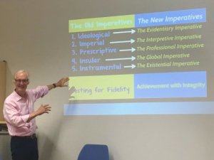 Eröffnet wurde das Treffen von einem öffentlichen Vortrag von Prof. Dr. Dennis Shirley vom Bosten College/USA und Mag. Livia Rößler von der Universität Innsbruck, die sich mit Potenzialen und Herausforderungen der Übertragung von konzeptionellen Ansätzen aus dem englischen Sprachraum in der Bildungssystementwicklung beschäftigten.