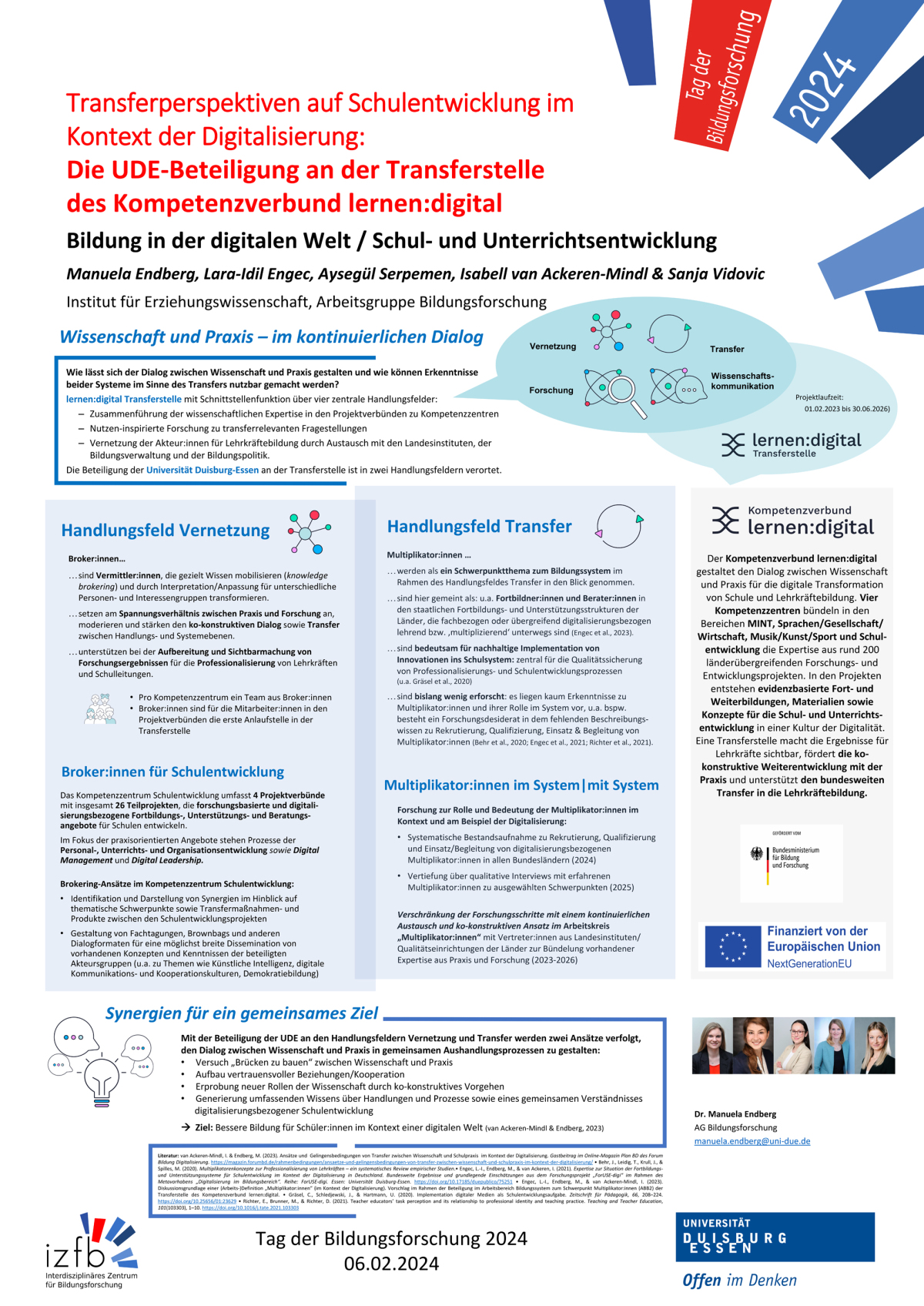 Serpemen, A. & Jäntsch, C. (2025). Formen der Zusammenarbeit zwischen Wissenschaft und Praxis als Element von Transfer im Kompetenzverbund lernen:digital. Symposium im Rahmen der im Rahmen der Tagung 'Digitale Transformation für Schule und Lehrkräftebildung gestalten'. (Oberstufenzentrum Ästhetik und Technik). Universität Potsdam, 29.-30.09.2025.