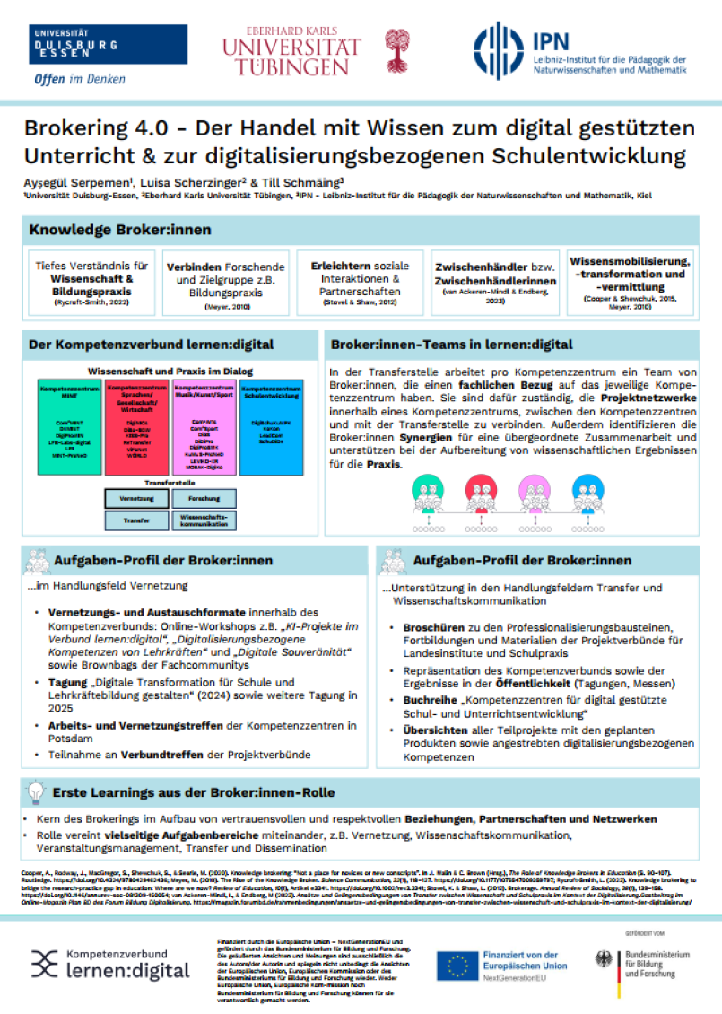 Scherzinger, L., Serpemen, A. Schmäing, T. (2025). Transferstrategie der Vernetzungs- und Transferstelle sowie der Broker:innen. Vortrag im Rahmen des Symposiums „Interdisziplinäre Transferstrategien im Kompetenzverbund lernen:digital“ . GEBF-Tagung der Gesellschaft für Empirische Bildungsforschung. Universität Mannheim, 28.01.2025.