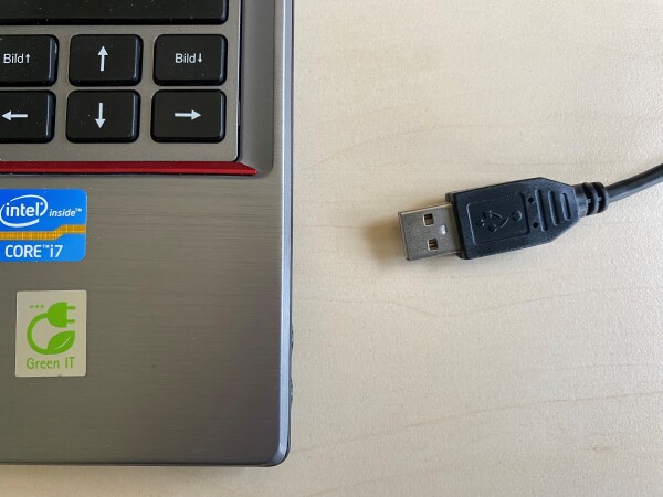 Verbinden Sie das USB-Kabel der Devio-Box (die Box links neben der Tafel mit dem QR-Code) mit ihrem Notebook. Folgende Komponenten werden kurz darauf automatisch erkannt und eingerichtet: