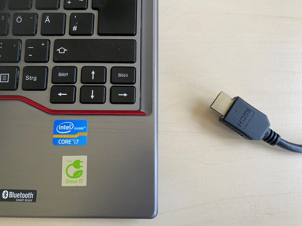 Verbinden Sie Ihr Notebook über das HDMI-Kabel mit dem Beamer, starten Sie Beamer und Notebook und melden sich an Ihrem Notebook an.