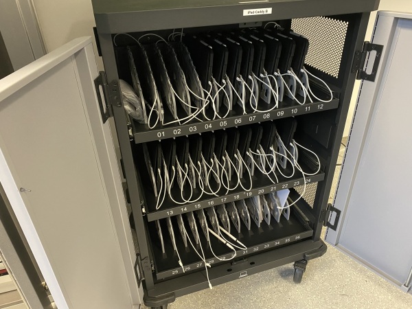 Unsere iPads stellen wir in zwei rollbaren Caddys (A + B) bereit, so dass die iPads im Caddy in den jeweiligen Lehrraum gebracht werden können. Die Caddys verfügen über einen Stromanschluss so dass die iPads immer in geladenen Zustand übernommen werden können. Jeder Caddy umfasst 30 iPads mit Apple-Pencil.