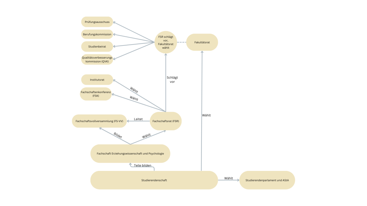 Auf dieser Seite wird ein Überblick über die Gremien geboten, die auf Ebene der Fakultät für Bildungswissenschaften oder der dem FSR zugerechneten Institute arbeiten. Für einen Überblick über die Gremien auf Hochschulebene lohnt sich ein Blick auf die Seite der Universität und des AStA.