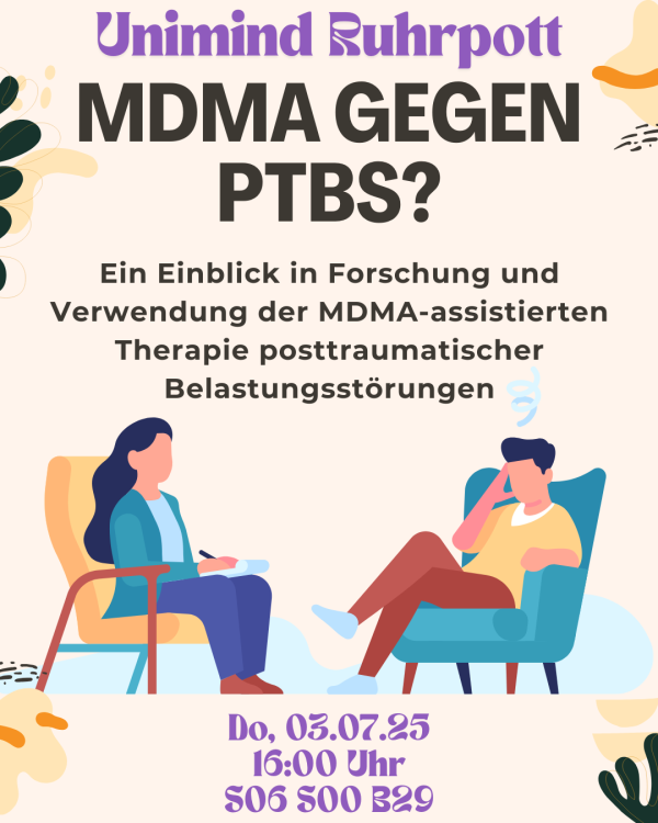 Im Rahmen des studentischen Angebotes "UniMind Ruhrpott" möchten wir uns in monatlichen Sitzungen mit dem Thema Psychedelika in Forschung & Wissenschaft auseinandersetzen. Hierbei steht das Debattieren über die wissenschaftlichen Erkenntnisse sowie die Erweiterung des eigenen Wissens anhand empirischer Quellen im Vordergrund.