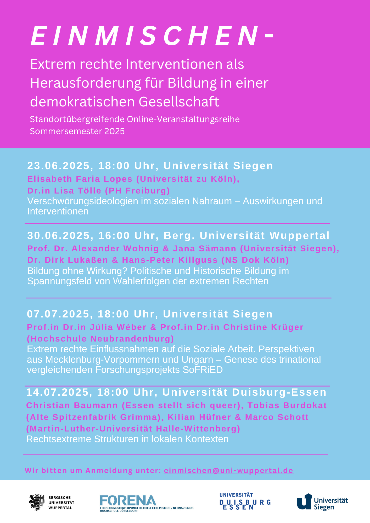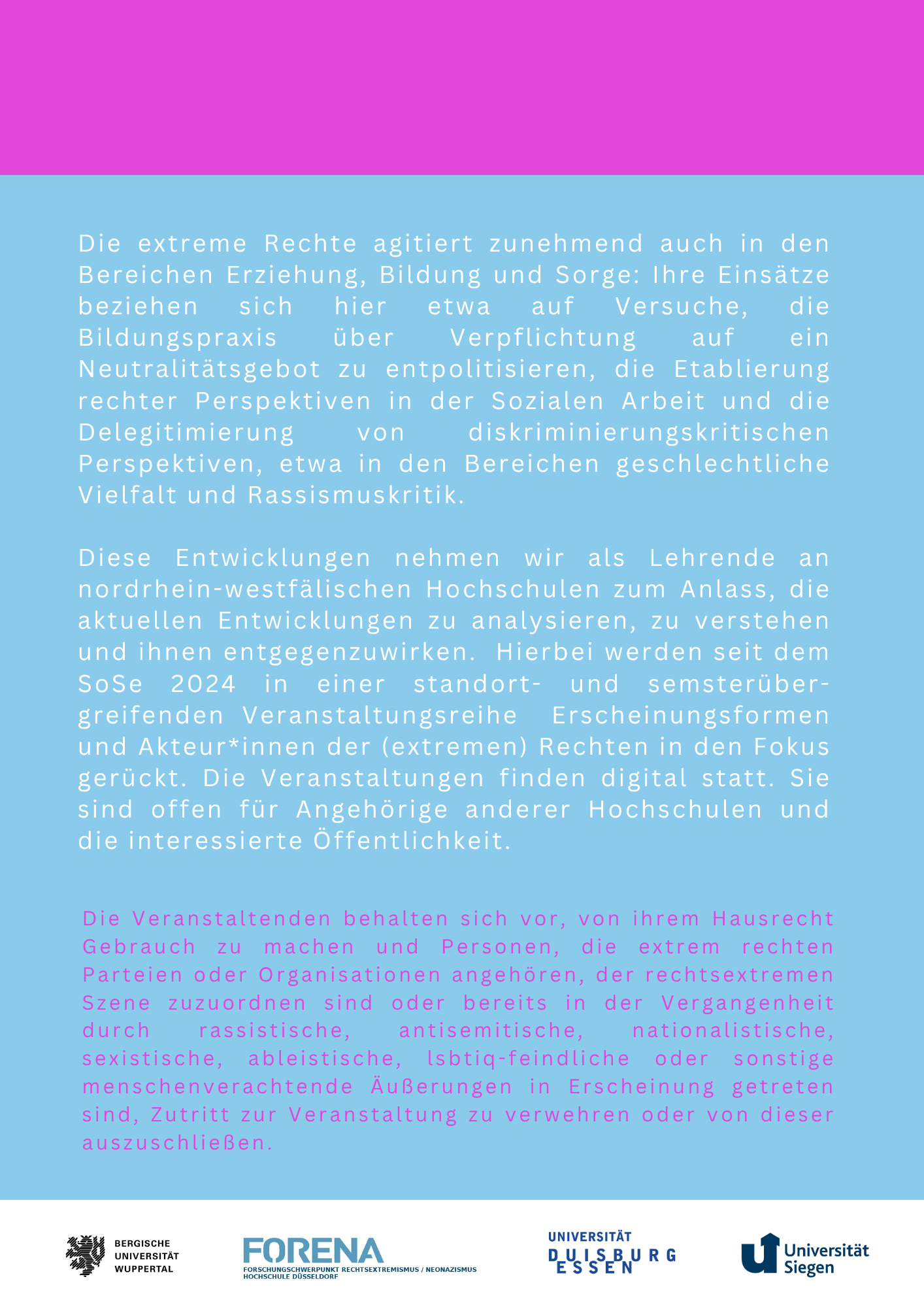 Die extreme Rechte agitiert zunehmend auch in den Bereichen Erziehung, Bildung und Sorge: Ihre Einsätze beziehen sich hier etwa auf Versuche, die Bildungspraxis über Verpflichtung auf ein Neutralitätsgebot zu entpolitisieren, die Etablierung rechter Perspektiven in der Sozialen Arbeit und die Delegitimierung von diskriminierungskritischen Perspektiven, etwa in den Bereichen geschlechtliche Vielfalt und Rassismuskritik. Diese Entwicklungen nehmen wir als Lehrende an nordrhein-westfälischen und baden-württembergischen Hochschulen zum Anlass, die aktuellen Entwicklungen zu analysieren, zu verstehen und ihnen entgegenzuwirken.